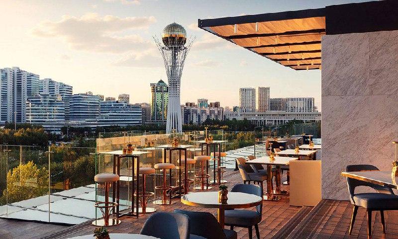 Stylish restaurant with panoramic views and an open kitchen at The Ritz-Carlton Astana.